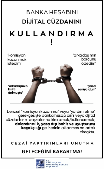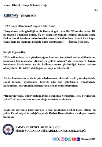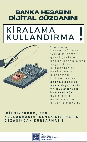 Sevgili Öğrencimiz, Son dönemde üniversite öğrencilerine ait banka hesapları ve dijital cüzdanların üçüncü kişiler tarafından kullanılması suretiyle dolandırıcılık, yasa dışı bahis ve uyuşturucu kaçakçılığı gelirlerinin aklanması gibi olaylarda ciddi artış yaşanmaktadır. Kendi adınıza kayıtlı banka hesaplarınızın veya dijital cüzdanlarınızın; “komisyon kazanma”, “borç ödeme yardımı”, “sadece bir kez kullanma”, “zararsız para transferi” veya benzeri gerekçelerle başkaları tarafından kullanılmasına bilerek ve isteyerek izin verilmesi, Türk Ceza Kanunu ve ilgili mevzuat kapsamında cezai ve hukuki sorumluluk doğurabilir. Hesaplarınız üzerinden gerçekleştirilen işlemlerden, işlemi fiilen yapan kişi kim olursa olsun, hesap sahibi olarak siz sorumlu tutulabilirsiniz. Hesaplarınızı başkalarına kullandırmanız durumunda; adli soruşturma ve kovuşturmalara muhatap olmanız, adli sicil kaydı oluşması, bankalar tarafından riskli müşteri olarak değerlendirilmeniz, banka hesaplarınıza kısıtlama getirilmesi, kredi ve kredi kartı başvurularınızın reddedilmesi, adli kontrol tedbirleri (yurtdışı çıkış yasağı dâhil) uygulanması ve mağdurlar tarafından tazminat davaları açılması söz konusu olabilir. Bu tür durumlarda “bilmiyordum”, “yardım etmek istedim” veya “sadece aracıyım” şeklindeki açıklamalar hukuken koruyucu olmayabilir. Tanıdığınız ya da tanımadığınız kişilerden gelen, hesap veya IBAN paylaşımı karşılığında kazanç vaadi içeren her türlü teklifi reddetmeniz ve şüpheli durumları derhâl güvenlik yetkililerine bildirmeniz önem arz etmektedir.